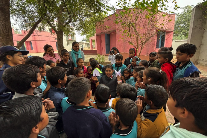 The village of Rajpur was calm when the group arrived quiet lanes, open skies, and the gentle rhythm of a day beginning. Like many rural learning spaces, the government school (Anganwadi) campus was simple and functional. There were modest rooms that served as learning spaces, a corridor area, and an open section where children could gather comfortably. The atmosphere carried that familiar energy of childhood curiosity, movement, quiet laughter, and the anticipation of something different from the regular timetable.